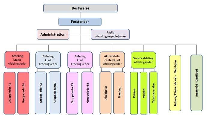 I 2011 ændrede vi vores organisering. Vi havde et ønske om at lægge afdelinger og områder sammen, således at ledergruppen blev mindre og dermed bedre rustet til fremtidens udfordringer. Den nye struktur betyder, at afdelingsledere, gruppeledere og medarbejdere har fået et større og anderledes arbejdsområde.